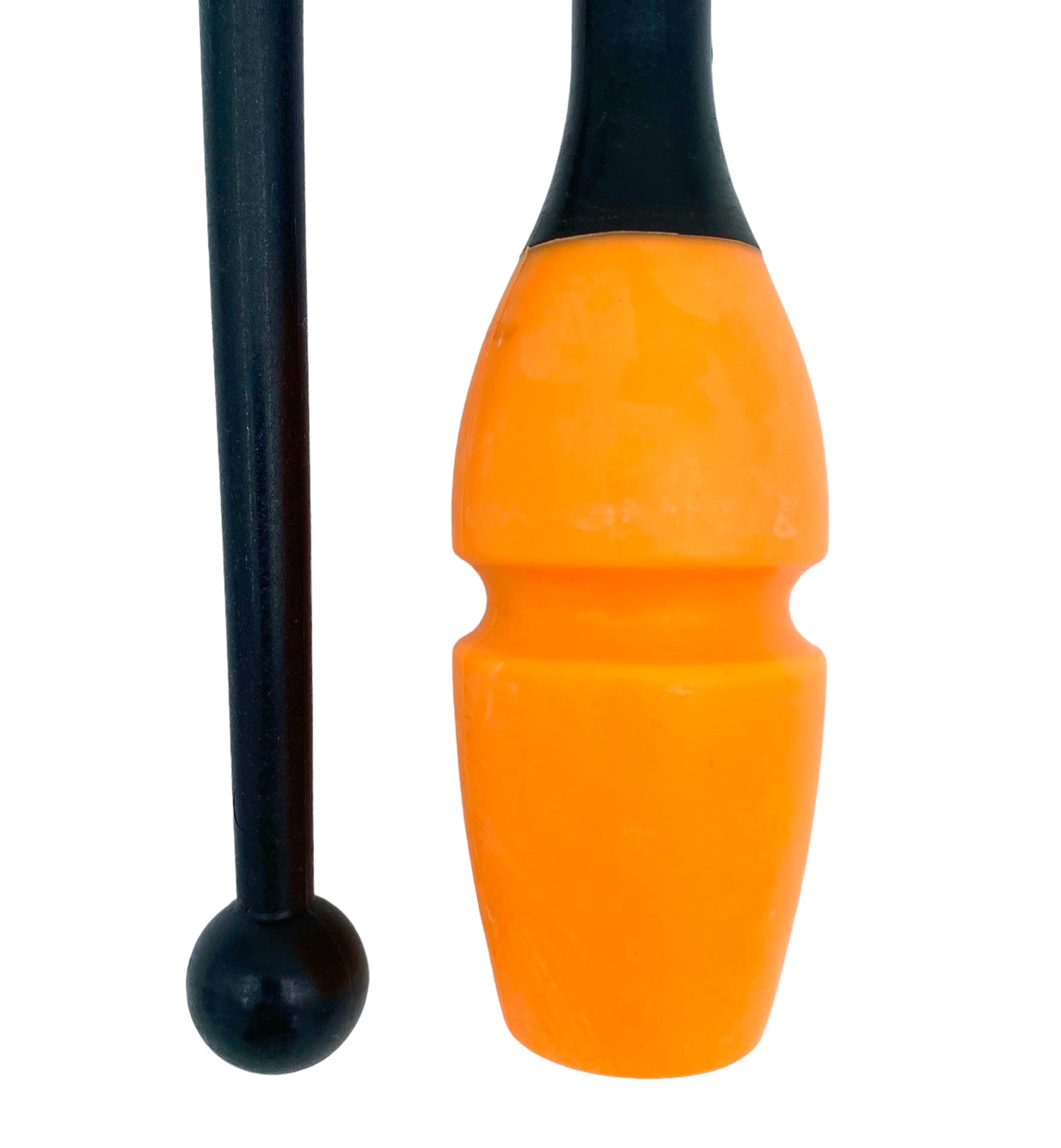 Tofarvet gymnastikkølle fra Pastorelli med en krop (den orange del) af gummi, hvilket gør, at køllen kan stødes mod gulvet og springe tilbage.