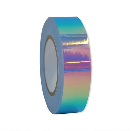Farverig tape med meget blank overflade. Tapen virker flerfarvet da omgivelserne spejler sig den.