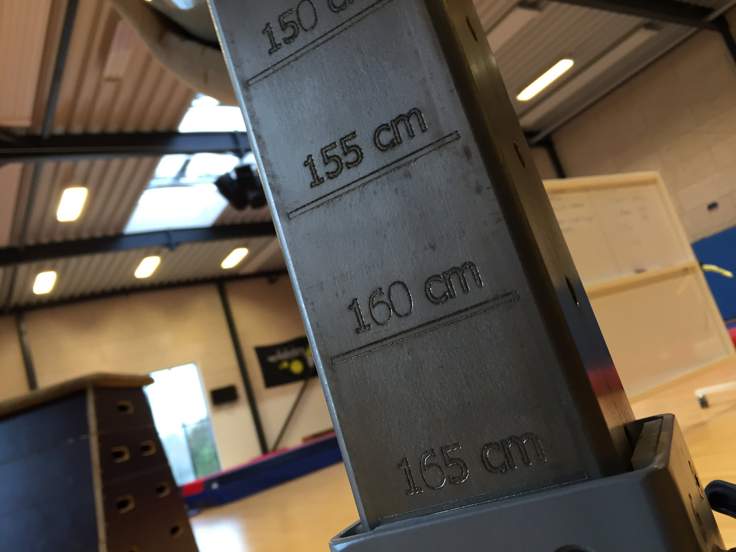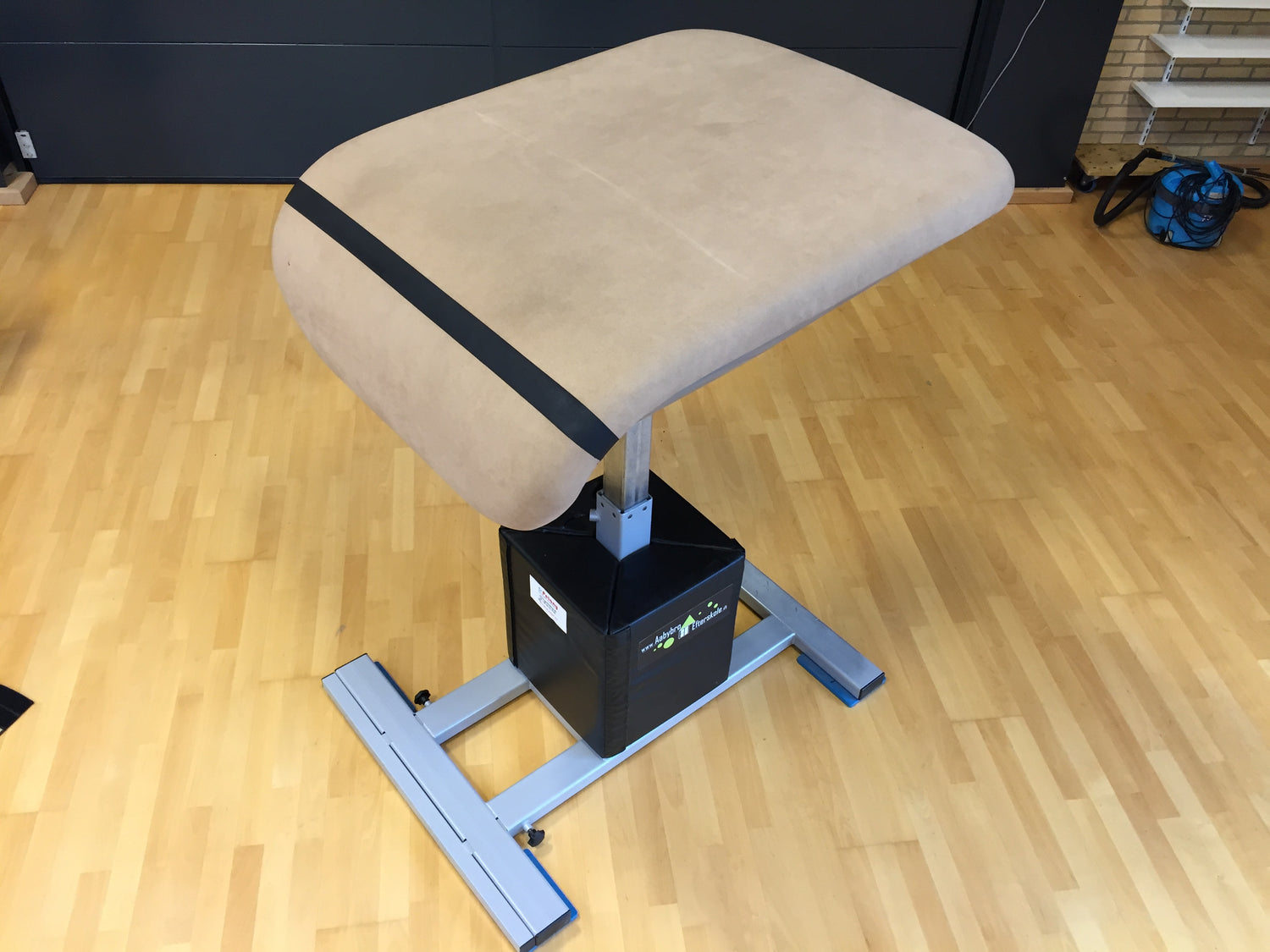 Monosøjle med gasfjeder til regulering af højde fra 125-165 cm.