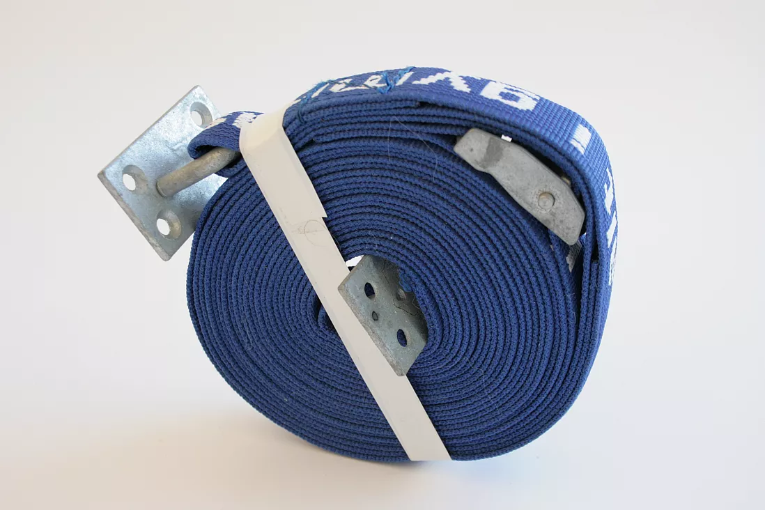 Spænderem med vægbeslag til fastgørelse af nedspringsmåtte mod væg. Justerbar spænderem. Passer til både 3 og 4 m. nedspringsmåtter. Fremstillet 40 mm. gjortbånd.