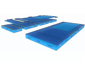 TEAMGYM landingsmåtten til trampet består af 3 stk. nedspringsmåtter som sættes sammen med velcro samt 1 stk. overlægsmåtte af støddæmpende skum.