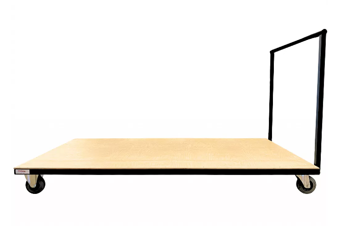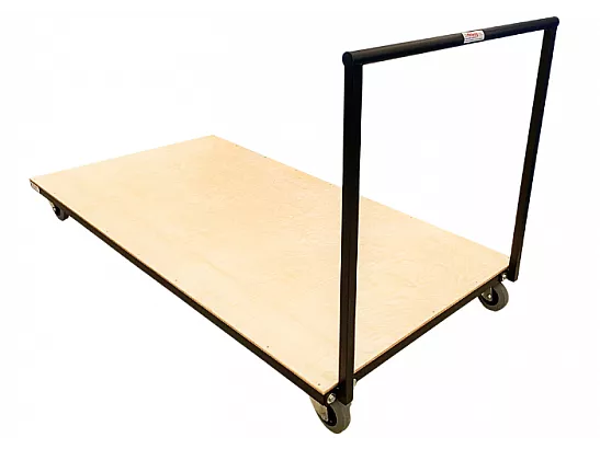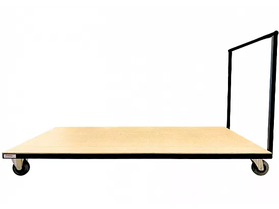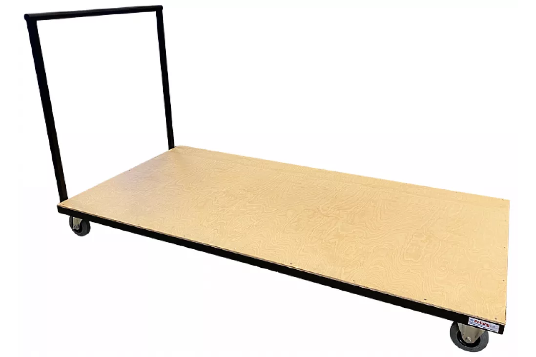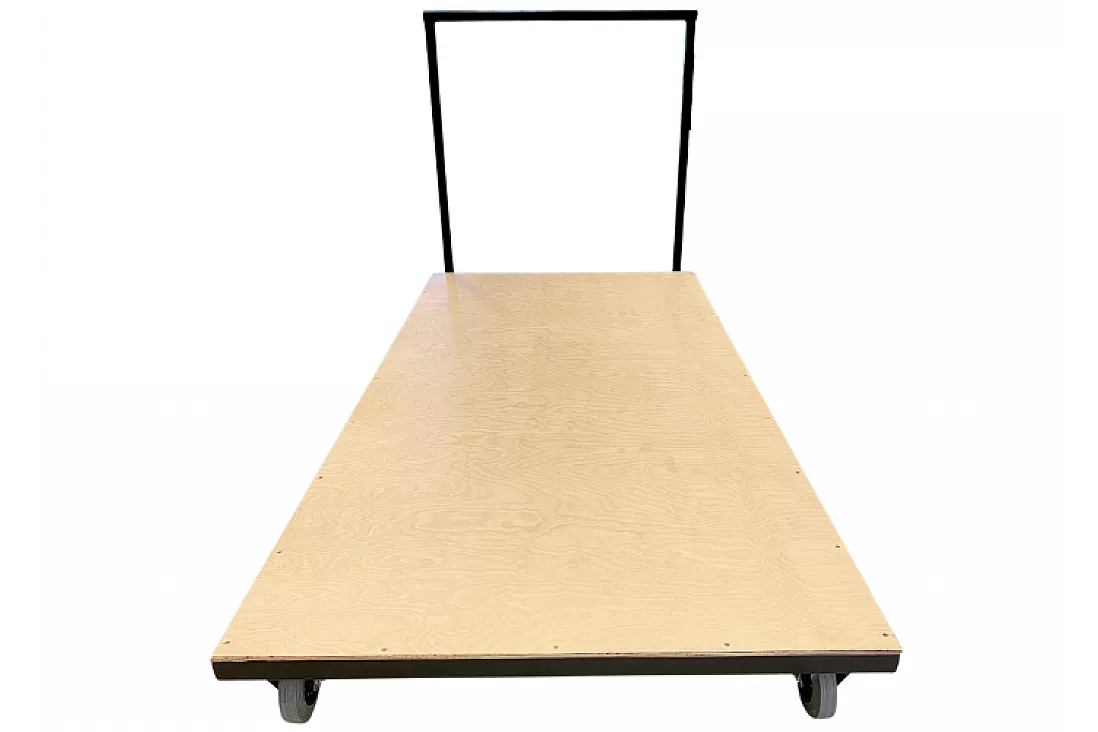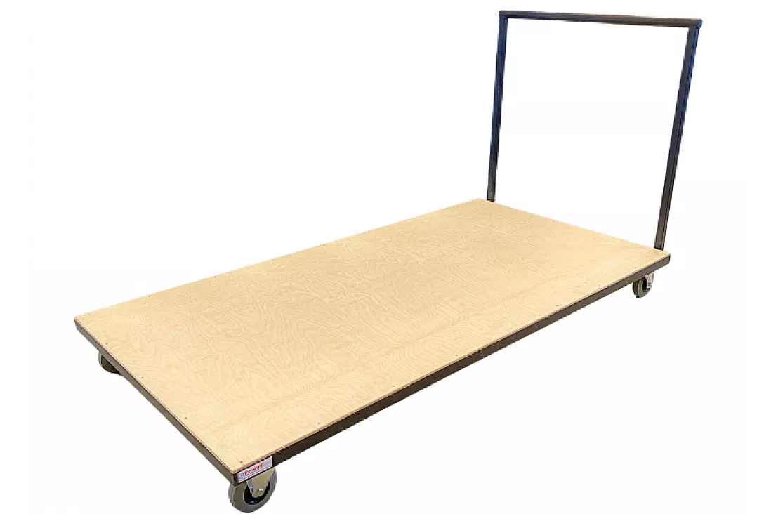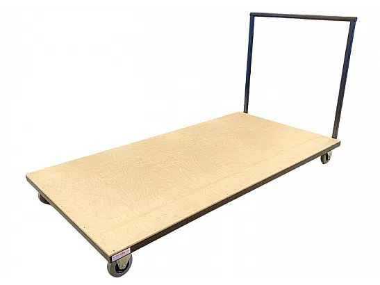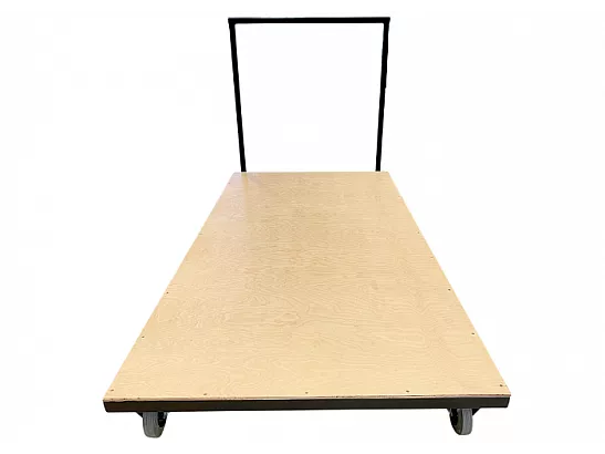Universalvogn til gymnastikredskaber. Bøjlen kan tages af hvis der er behov for det. Men træplade på bunden. Vognen er 1 meter bred og 2 meter lang.