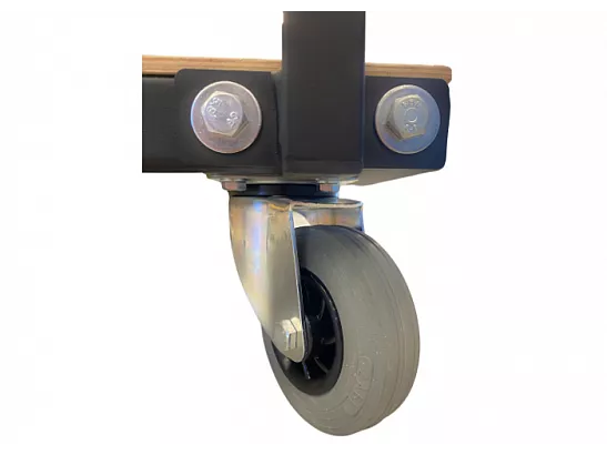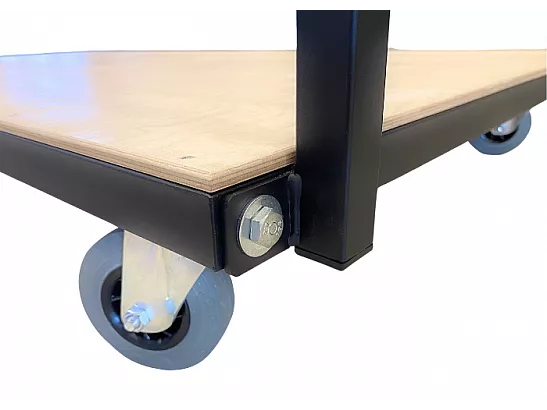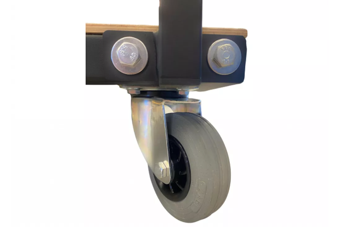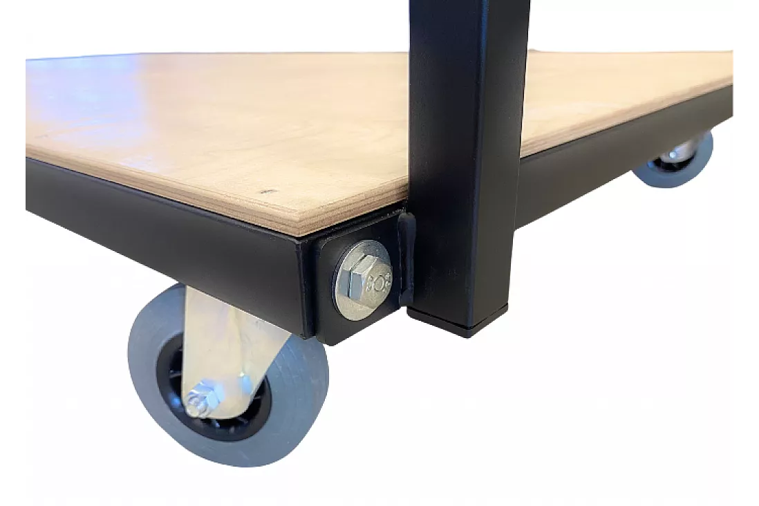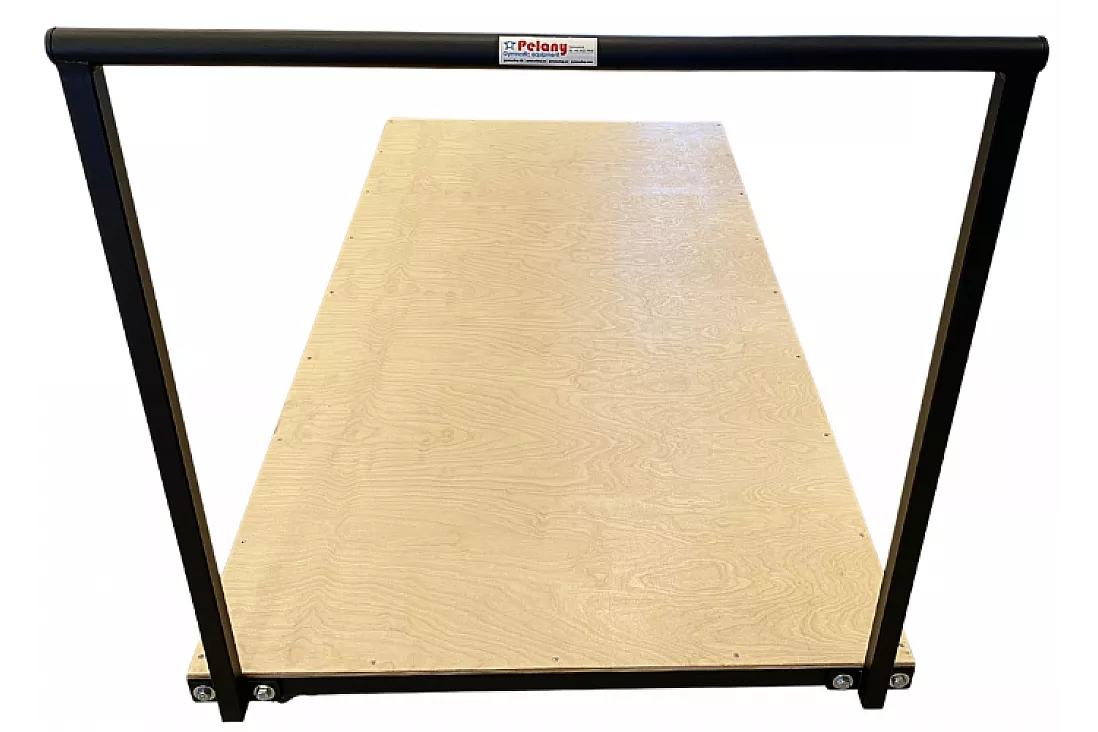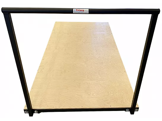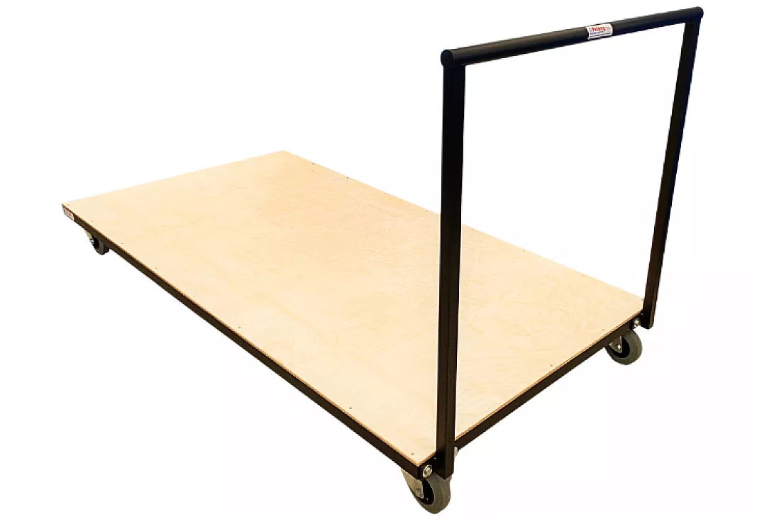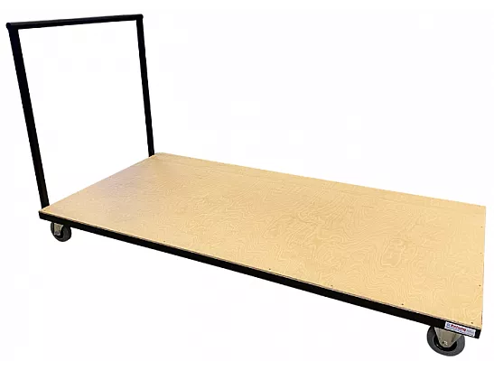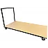 Universalvogn til gymnastikredskaber. Bøjlen kan tages af hvis der er behov for det. Men træplade på bunden. Vognen er 1 meter bred og 2 meter lang.