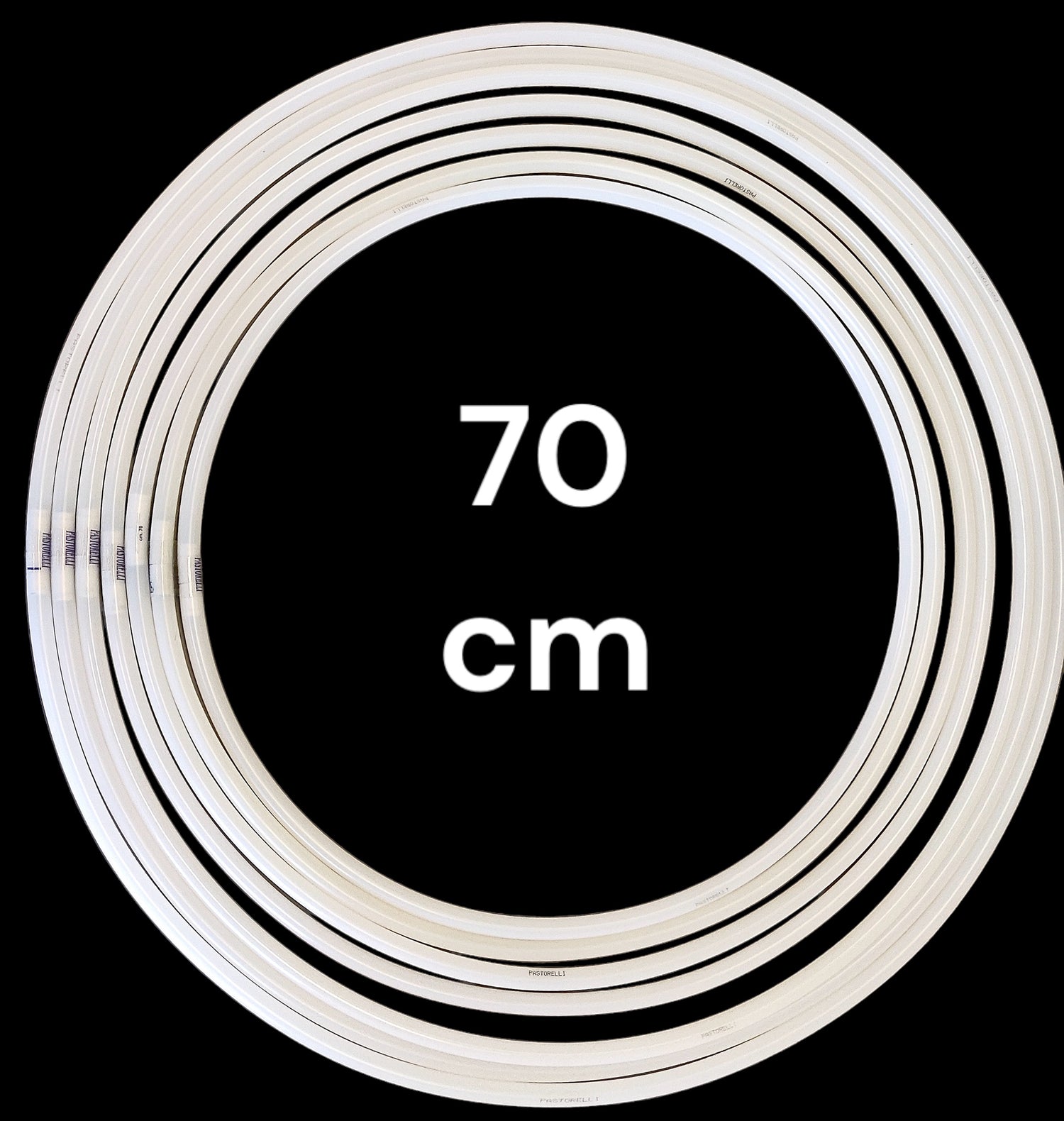 Tøndebåndet er 70 cm. i diameter (indvendigt mål) og den runde plastprofil er 14-15 mm i diameter.